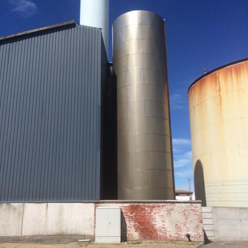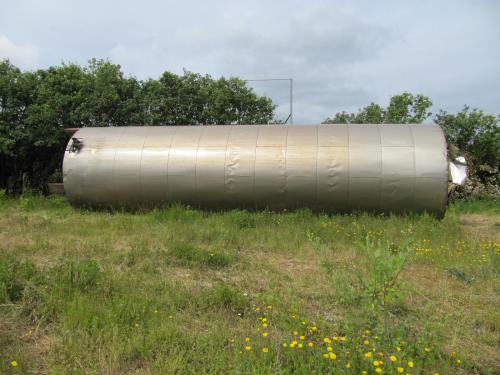 100 m3 opretstående isoleret jerntank.Stående på 4 ben.Mandeluge i siden.Rustfri beklædning udenpå isoleringen.Dimensioner : ø 3400 x 13.400 mmCa 13 tons