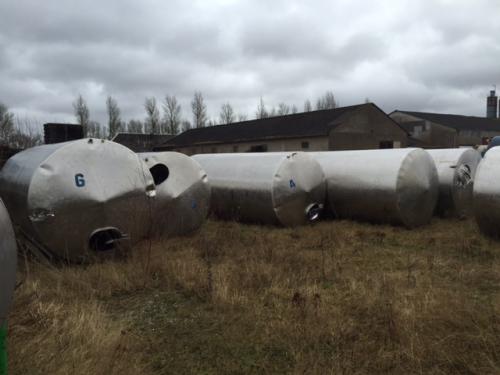 Liggende rustfrie tankeMandeluge i endenForskellige størrelser ind og udløbDe er alle lettere bulede.