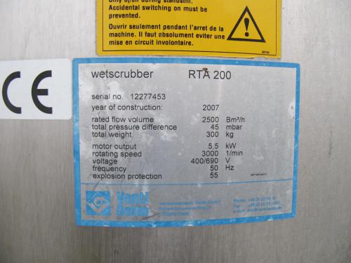 SOLGTVåd scrubber RTA 200Rustfri scrubber til gasvaskning.Indløb 8" - ø 200 mmUdløb i bunden 4" - ø 100 mmAfgang top 6" - ø 150 mm